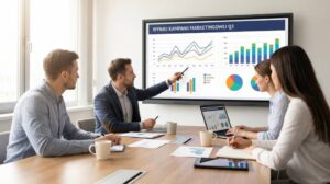 Spotkanie biznesowe z prezentacją wyników kampanii marketingowej na ekranie, uczestnicy analizują wykresy i dane