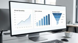 Dashboard analityczny pokazujący wykresy wzrostu sprzedaży, ruchu na stronie i konwersji z kampanii marketingowych